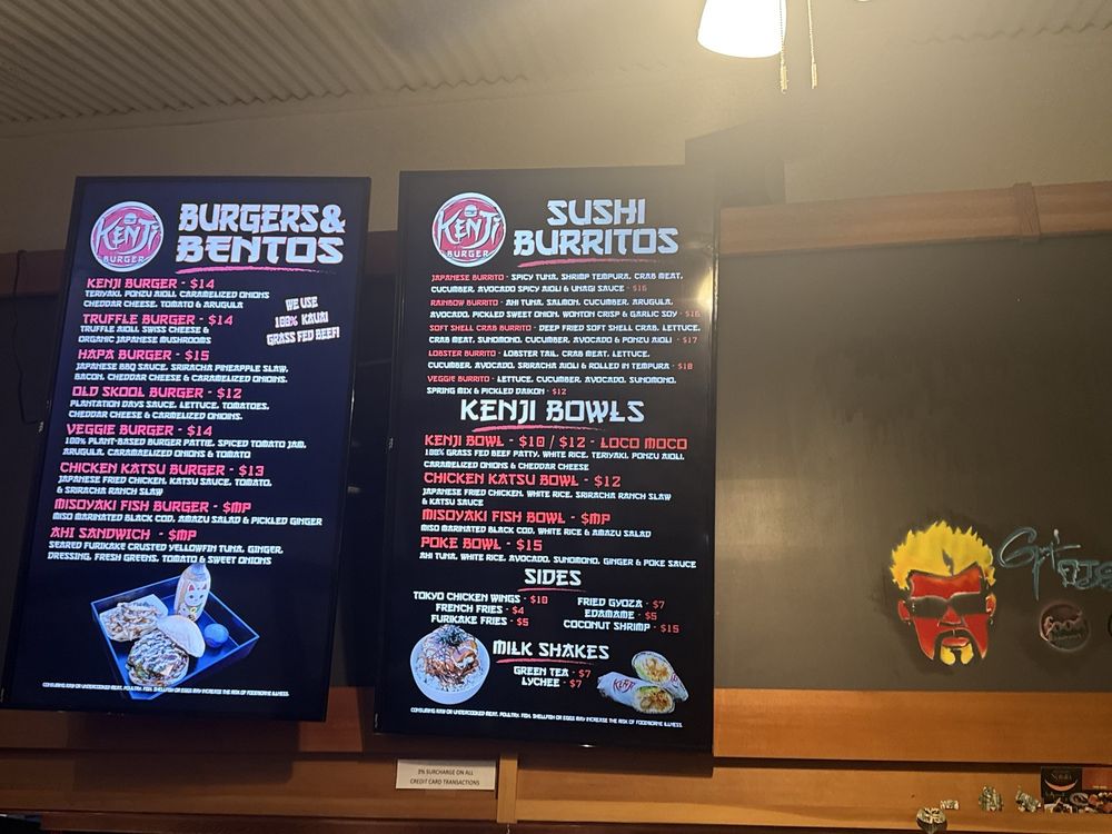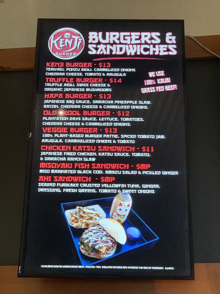 Kenji Burger, located in Kapaa, Hawaii, offers a diverse menu of burgers, sandwiches, and sides with a unique Japanese twist. The Truffle Burger with truffle aioli, Swiss cheese, and organic Japanese mushrooms stands out as a flavorful option made with 100% Kauai grassfed beef. Another must-try is the Hapa Burger, featuring Japanese BBQ sauce, bacon, Cheddar cheese, sriracha pineapple slaw, and caramelized onions. The eclectic mix of flavors and high-quality ingredients make Kenji Burger a top choice for burger enthusiasts. Customers praise the moist and delicious burgers, crispy fries, and standout items like the lychee milkshake. The friendly service and inviting ambiance add to the overall dining experience, making Kenji Burger a go-to spot for a satisfying meal in a laid-back atmosphere.